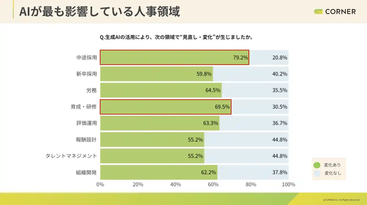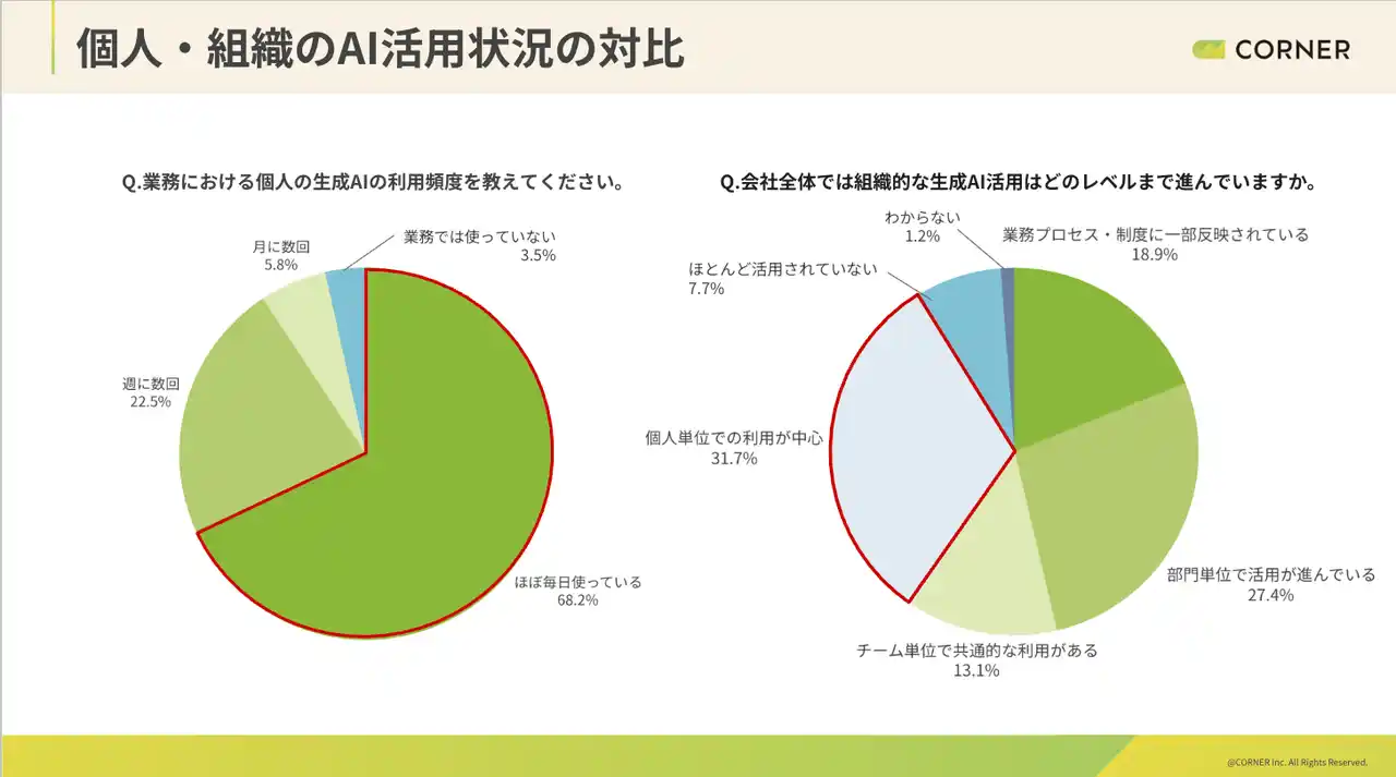 人事プロフェッショナルブティック「CORNER」を運営する株式会社コーナー(東京都渋谷区)は、企業の人事担当者259名を対象に「AI時代における人事・組織の実態調査」を実施し、個人・組織・人事それぞれのAI活用状況や、業務への影響、活用が深まらない理由を多角的に調査しました。 |