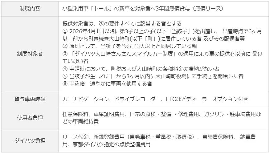2026年4月より開始する「ダイハツ大山崎さんさんスマイルカー制度」では、大山崎町内に居住している第3子以上を出産した等の一定条件を満たした住民に対して、ダイハツ京都(大山崎)工場で生産した小型乗用車「トール」を、京都ダイハツを通じて対象者へ3年間無償貸与(無償リース契約)します。 |