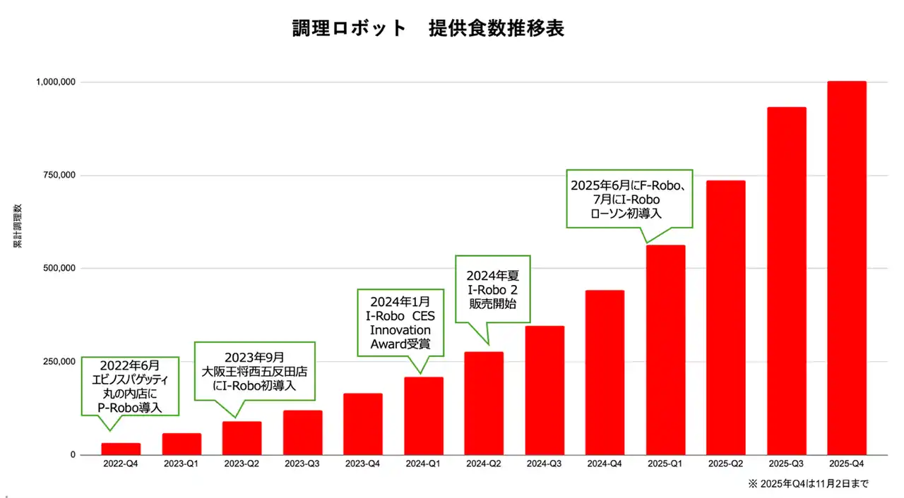 これらのロボットが飲食店・コンビニ厨房・テーマパーク・社員食堂等で提供した食事の累計が、2025年11月時点で100万食を突破(自社調べ)。