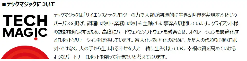 テックマジックは、2018年2月に設立。「サイエンスとテクノロジーの力で人類が創造的に生きる世界を実現する」をパーパスに掲げ、食を取り巻く多くの企業が直面する人手不足を解消し、人がより付加価値の高い業務に従事し、生産性の高い社会を実現するために、最新のAIやロボット技術を高度に融合した各種プロダクトの企画、設計、販売、保守を行っています。 |