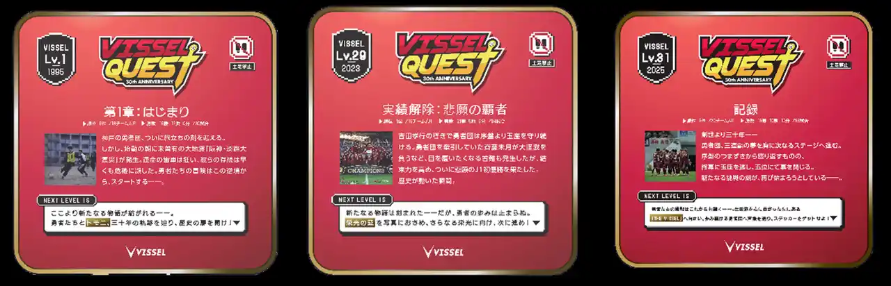 「VISSEL QUEST」は、ヴィッセル神戸を勇者に見立て、神戸の街とトモニ歩み続けてきた“30年間の冒険”を追体験するRPG型のイベントです。神戸・三宮センター街1丁目のご協力のもと計24日間にわたって開催します。 |