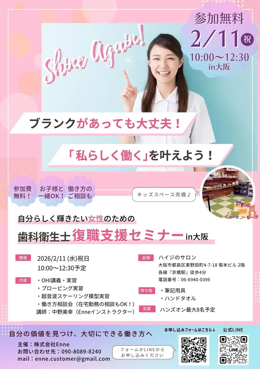 歯科に特化した採用支援・人材紹介事業を展開する株式会社Enne(所在地:兵庫県芦屋市、代表:桑原麻莉)は、同社が運営する歯科人材紹介マッチングサービス「シカリンク」を通じて、こうした悩みを抱える歯科衛生士の復職を支援する無料セミナーを、2026年2月11日(水・祝)10時より大阪市内で開催します。 |
