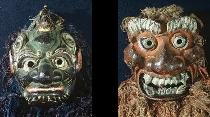 儀式の際に鬼役が着用する『追儺面(ついなめん)』は、室町時代に制作されたと考えられる、県内で最も古い追儺面です。赤鬼面と青鬼面の個性的な表情に注目です。 |