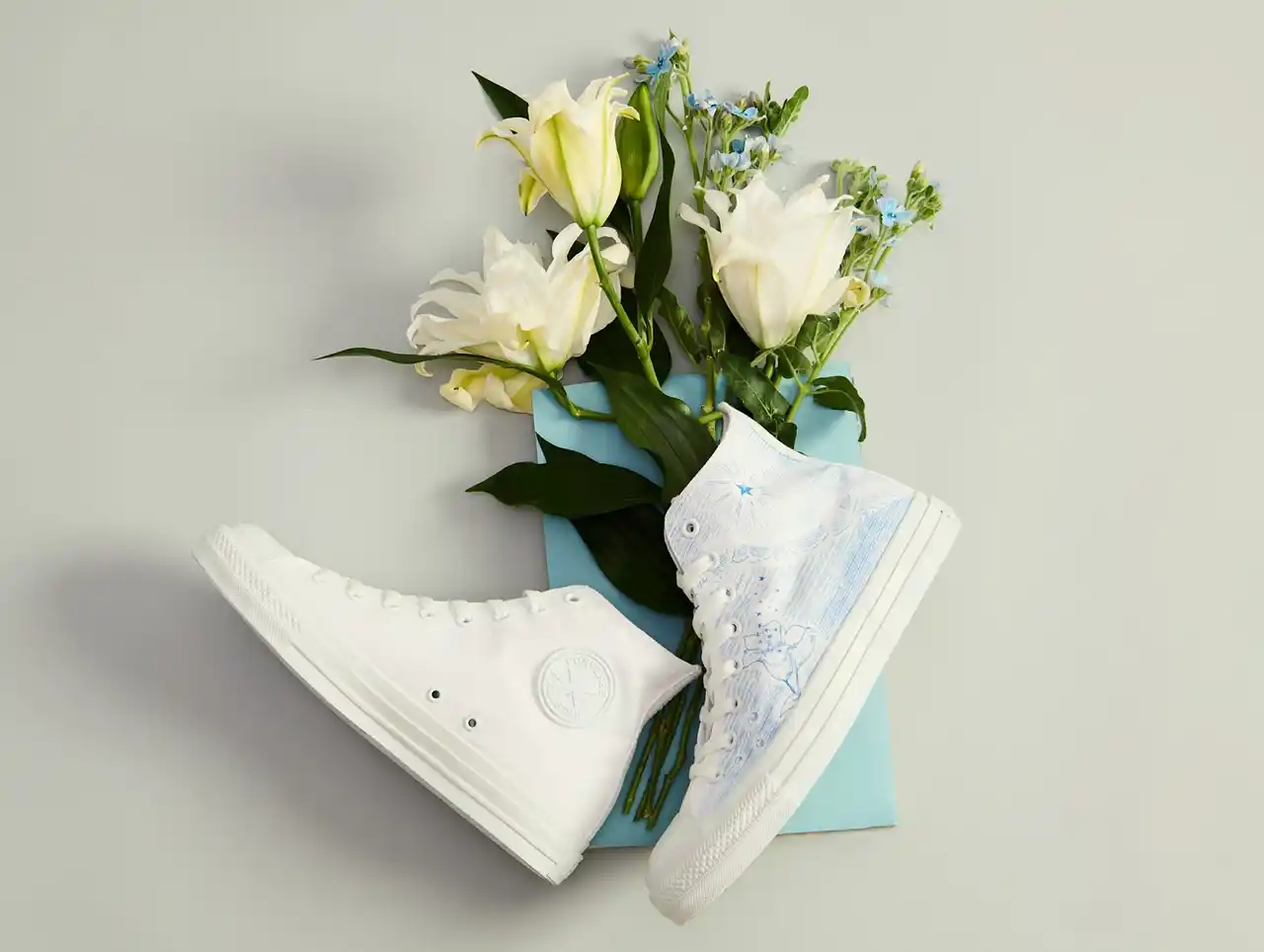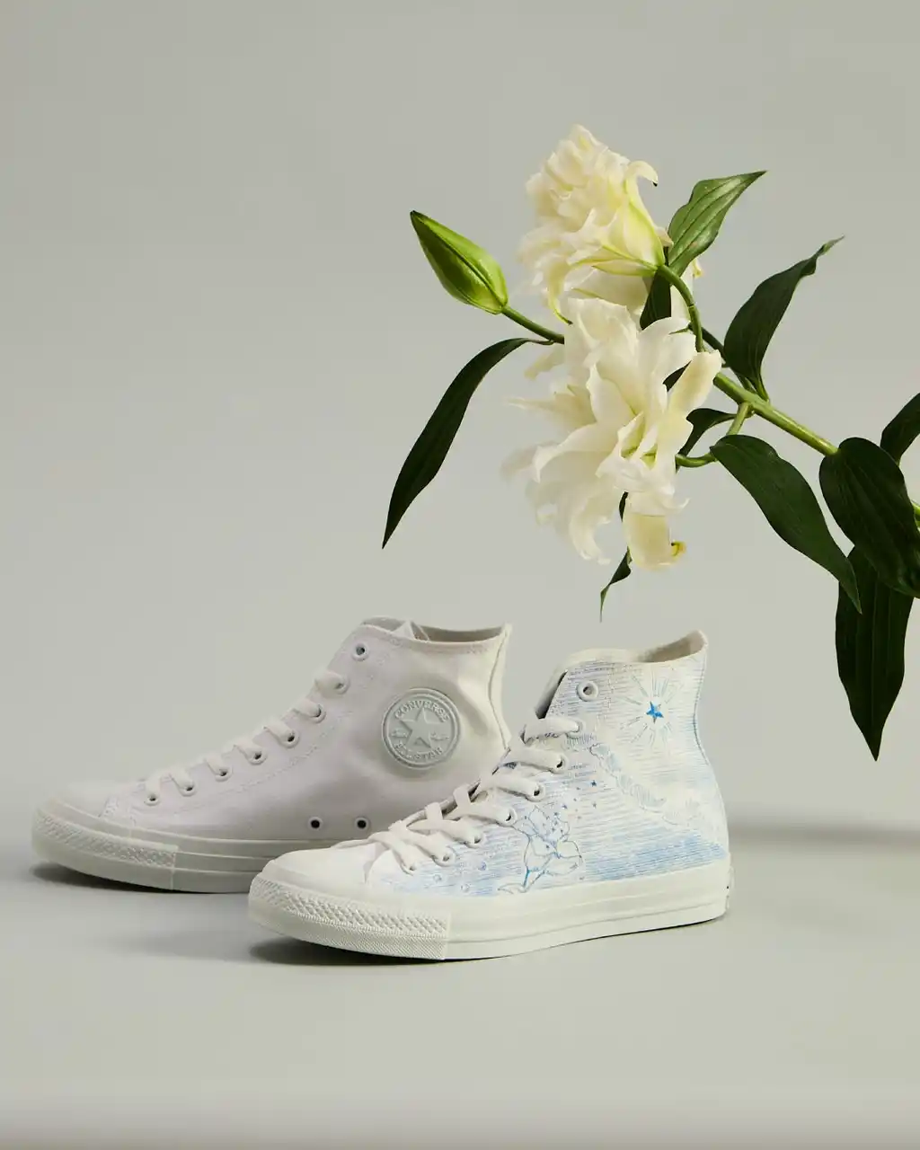 真珠がもつ「試練を越える強さ」という意味を重ね、新たな歴史を切り拓く人々へのエールを込めています。さらに、物語で印象的に登場する百合は、CONVERSE TOKYOが大切にしてきたモチーフのひとつ。今回はその百合をブランドを象徴する存在として描き、“希望”と“新しい夜明け”を意味する“暁の星”の光とともに、新たな物語を紡ぐ一足へと昇華しています。 |