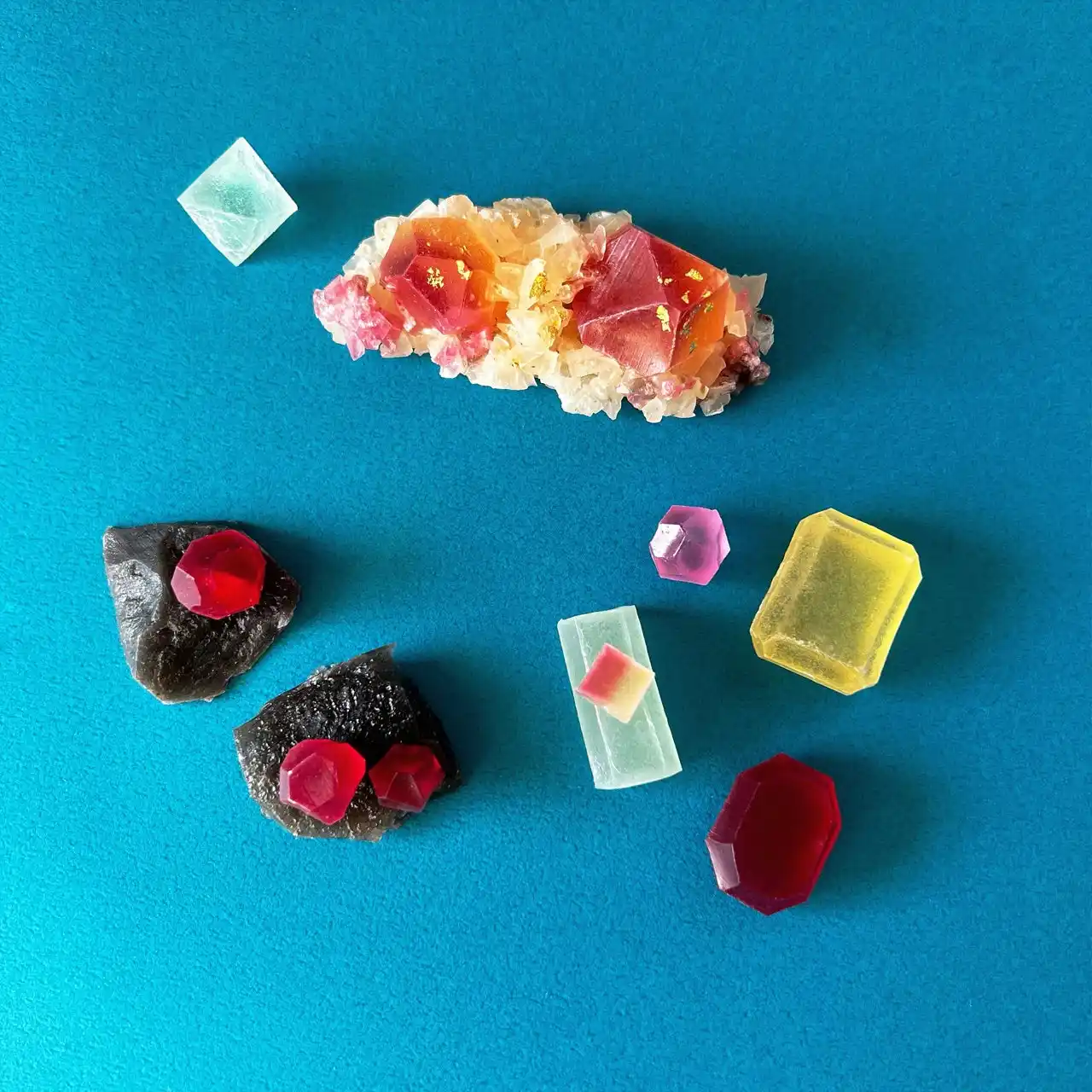 切りたての琥珀糖がまるで本物の鉱物のように輝く |