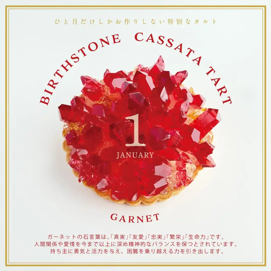 毎月販売開始すぐに完売する人気商品誕生石のタルトに、1月限定バージョンが登場。赤が印象的な1月の誕生石ガーネットを、カシス味のこうぶつヲカシでダイナミックにあしらい、まるで本物の鉱物のように仕上げました。ひとつひとつ、職人の手によって丁寧に切り出される琥珀糖の“切りたての輝き”は、このタルトならではの特別な魅力。大切な人への贈り物にはもちろん、1年を頑張った自分へのご褒美にもふさわしい、特別な一品に仕上がりました。 |