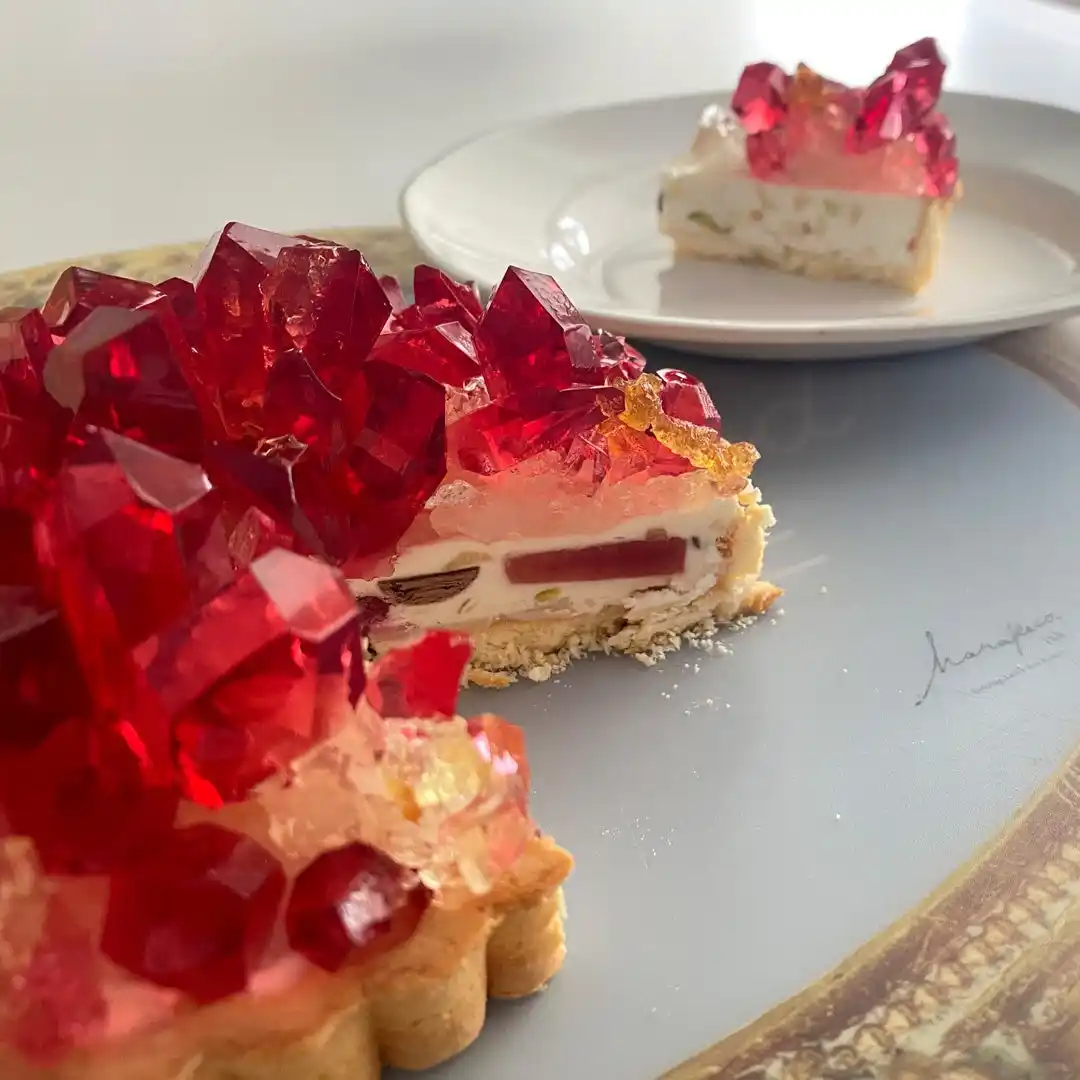 「ArtなFoodであそぶ」をテーマにプロダクトを展開するメルティングポットハラペコラボ株式会社(所在地:福岡県福岡市、以下 ハラペコラボ)から、1月の誕生石ガーネットを切りたての琥珀糖の輝きで表現した【誕生石のタルト~1月ガーネット~】が数量限定で登場。ひとつひとつ職人が切り出す、まるで宝石のようなアイスケーキです。公式オンラインストアにて、2025年12月25日正午より販売開始、12月26日より全国発送いたします。 |