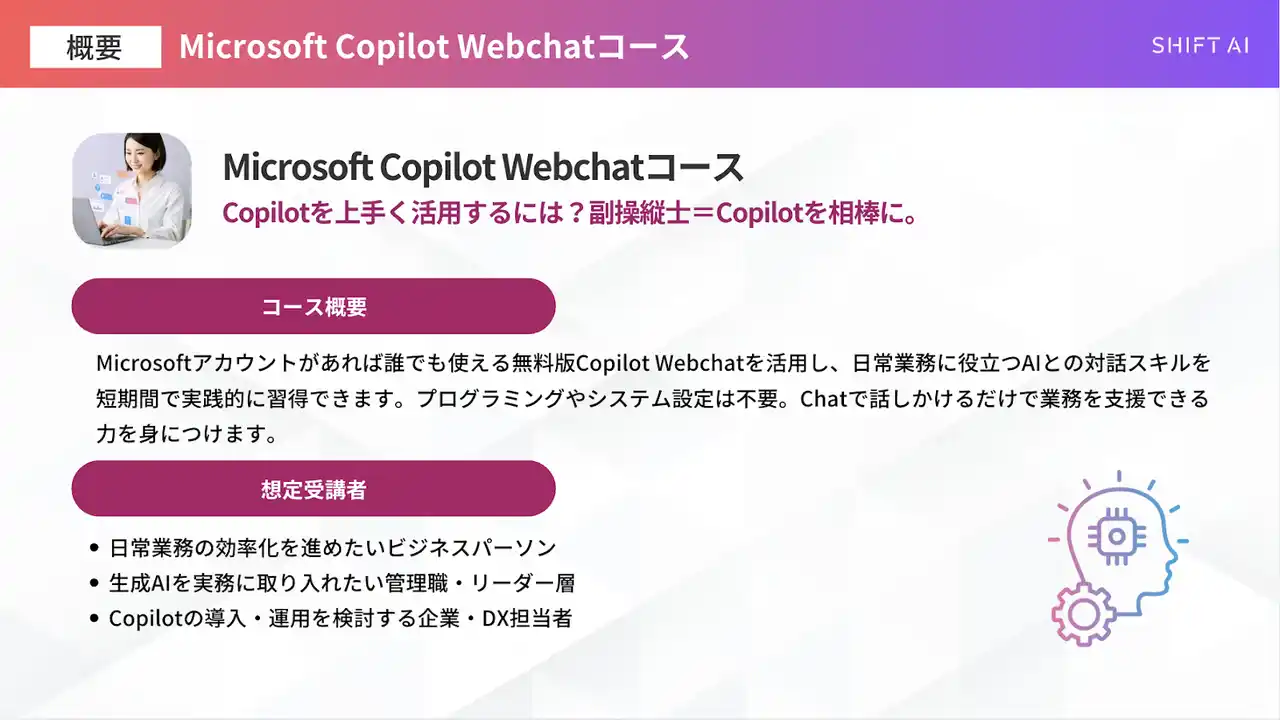 「日本をAI先進国に」を掲げAIのビジネス活用を学べる利用者数No.1※の生成AIコミュニティ「SHIFT AI」を運営する株式会社SHIFT AI(東京都渋谷区、代表取締役 木内翔大、以下当社)は、日常業務の効率化を目指す企業・組織向けに、「Microsoft Copilot Webchatコース」を2025年10月より提供を開始しました。この度、新たにWebchat機能でできるCopilot活用術として「ペルソナ・カスタマージャーニー編」「仮説思考編」「ビジネス英語トレーニング編」などを盛り込んだ動画を4本提供します。ブラウザ上で利用できる「Microsoft Copilot Webchat」を中心に、AIとの対話を通じて業務を効率化・自動化する実践スキルを体系的に学べる構成となっています。 |