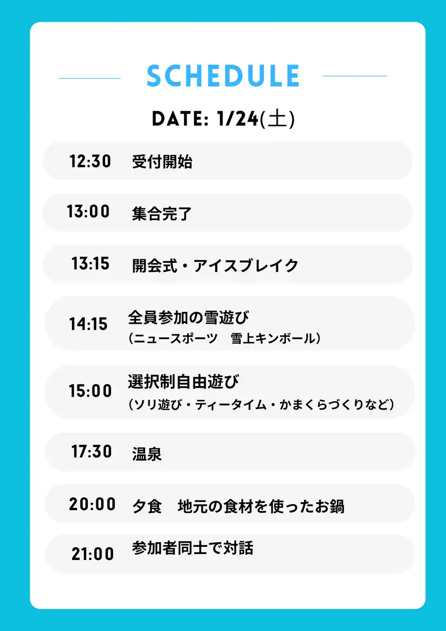 主催: 株式会社ジョブライブ(無人島プロジェクト) 日時:2026年1月24日(土)~25日(日) 会場:雪原学舎(新潟県十日町) ※十日町駅よりバスで20分 参加費:1泊2日29,800円(1日目夕食,2日目朝食込み) |