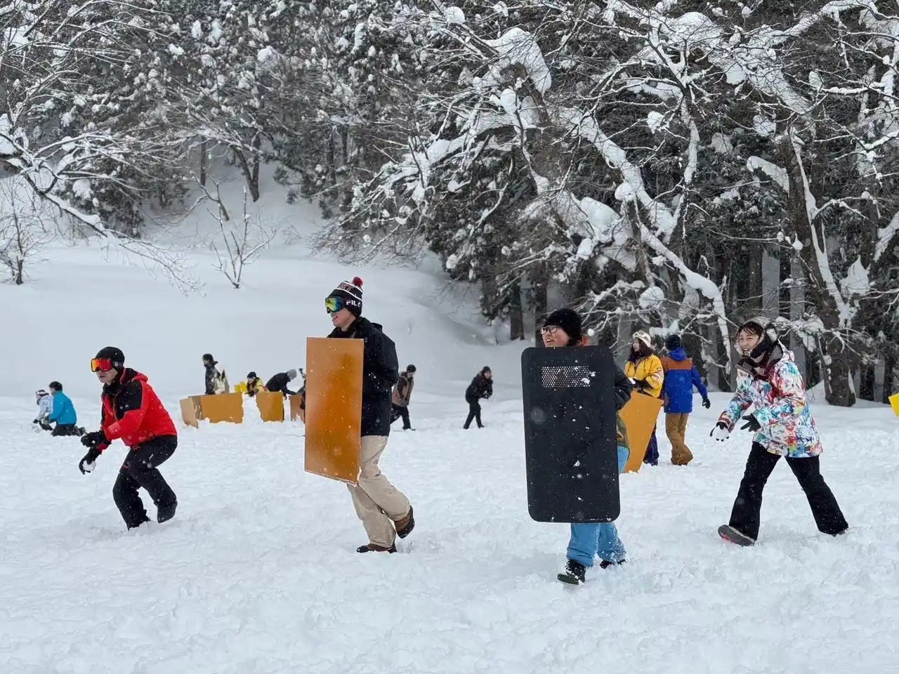| 雪合戦ではチームでまず作戦立案を行い、使用する武器(シールド、壁、雪玉作成装置、雪玉パチンコなど)の選択、そして自チームの陣地の設計を行います。その後フラック争奪戦やバトルロワイヤル形式などでチーム同士が戦い、雪上で知力と体力を駆使した熱いバトルを繰り広げます。 | |||||||||