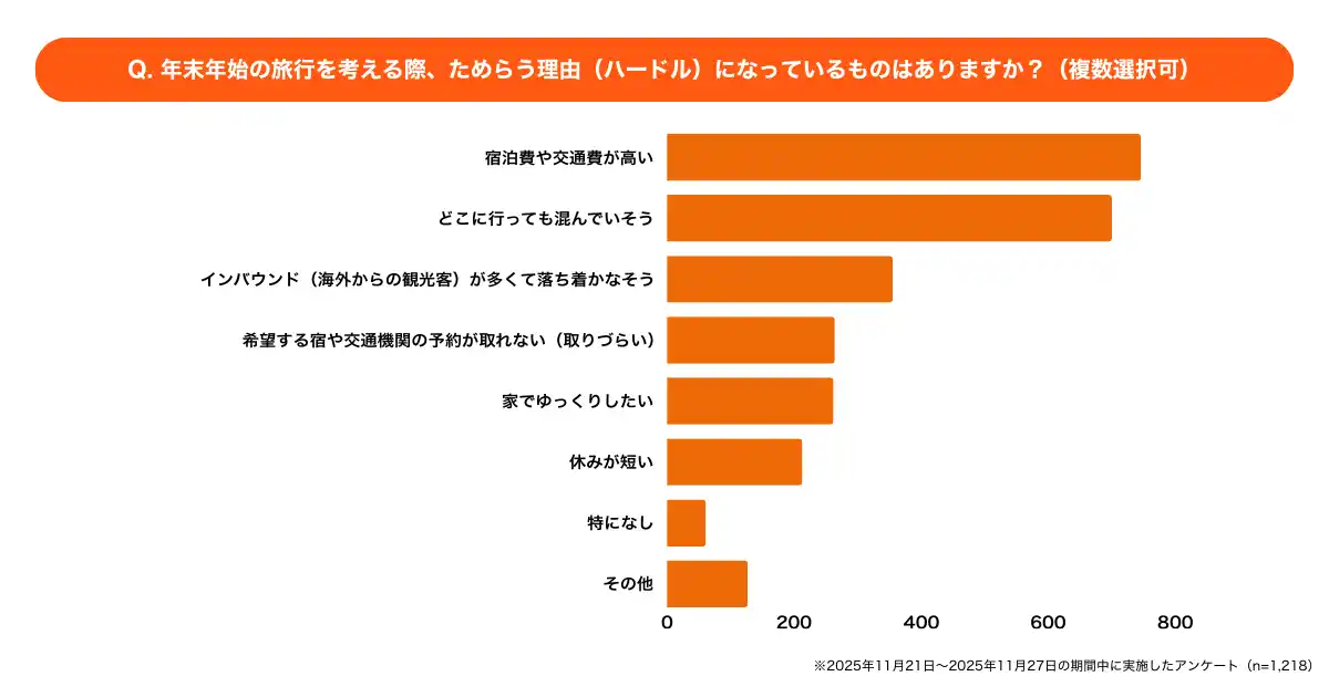 2つの大きなハードル: 年末年始の旅行をためらう理由(複数回答)は「宿泊費や交通費が高い(61.2%)」と「どこに行っても混んでいそう(57.5%)」が突出しています。 |