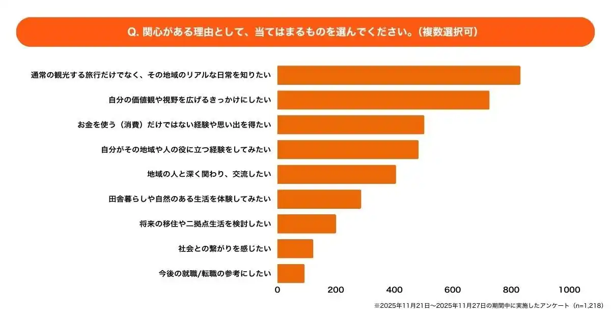 物価高や混雑が年末年始の旅行のハードルとなっていることに加えて、旅行者が旅・旅行に求める価値観そのものも変化しています。『有名な観光地や名所を巡る一般的な「旅行」だけでなく、地域の人と交流したり、その地域ならではの生活を体験するような旅にも関心がありますか?』という問いに対し、96.9% が「関心がある」と回答しました。その理由として、「その地域のリアルな日常を知りたい(70.5%)」や「自分の価値観や視野を広げるきっかけにしたい(61.5%)」が上位に挙がりました。 |