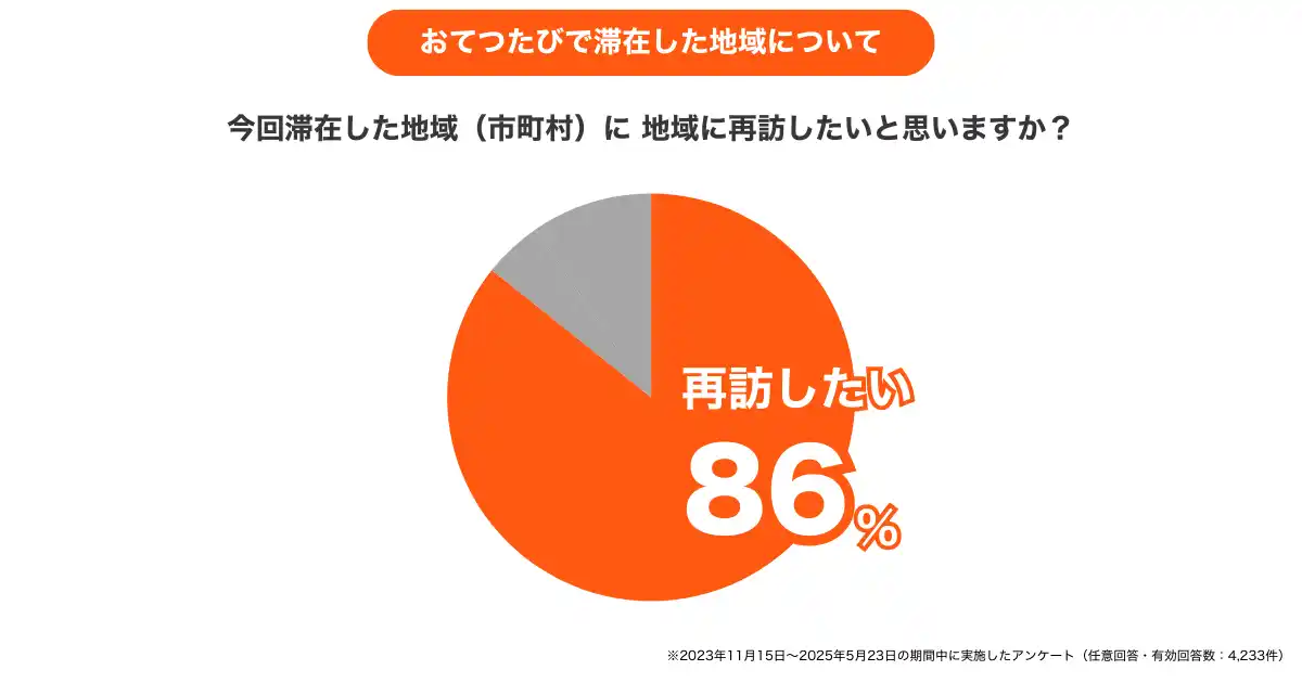 おてつたび参加者の86%が「また滞在した地域に再訪したい」と回答しており、おてつたびのような「地域と関わる旅(関係旅行)」によって、一度きりの観光では終わらない繋がり(関係人口)が生まれていることが分かります。 |