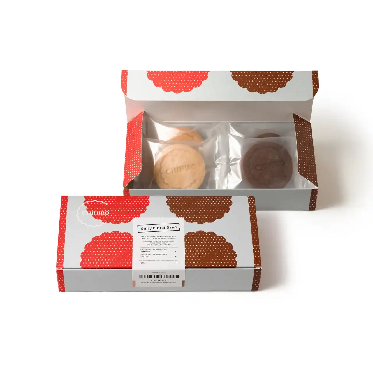 | しっとりサクサクのサブレでバタークリームをサンドした〈ちひろ菓子店〉の新しいスイーツ。「フランボワーズ」は、塩バターサブレでホワイトチョコバタークリームとフランボワーズコンフィチュールをサンド。「ショコラ」は、塩チョコレートサブレでダークチョコバタークリームとキャラメルミルクジャムをサンドし、甘さとさわやかさが口の中いっぱいに広がります。どちらも2個ずつ入った4個入りのほか、8個入りのアソートや2個入りもご用意しています。 | |||||||||