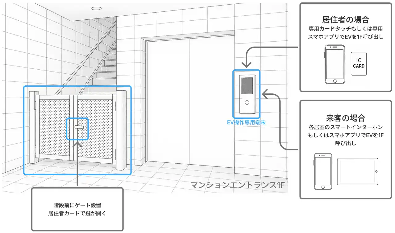 | エレベーター呼び出しを行うことで、エレベーターが1階へ自動で降りて来訪者を迎え、 | |||||||||