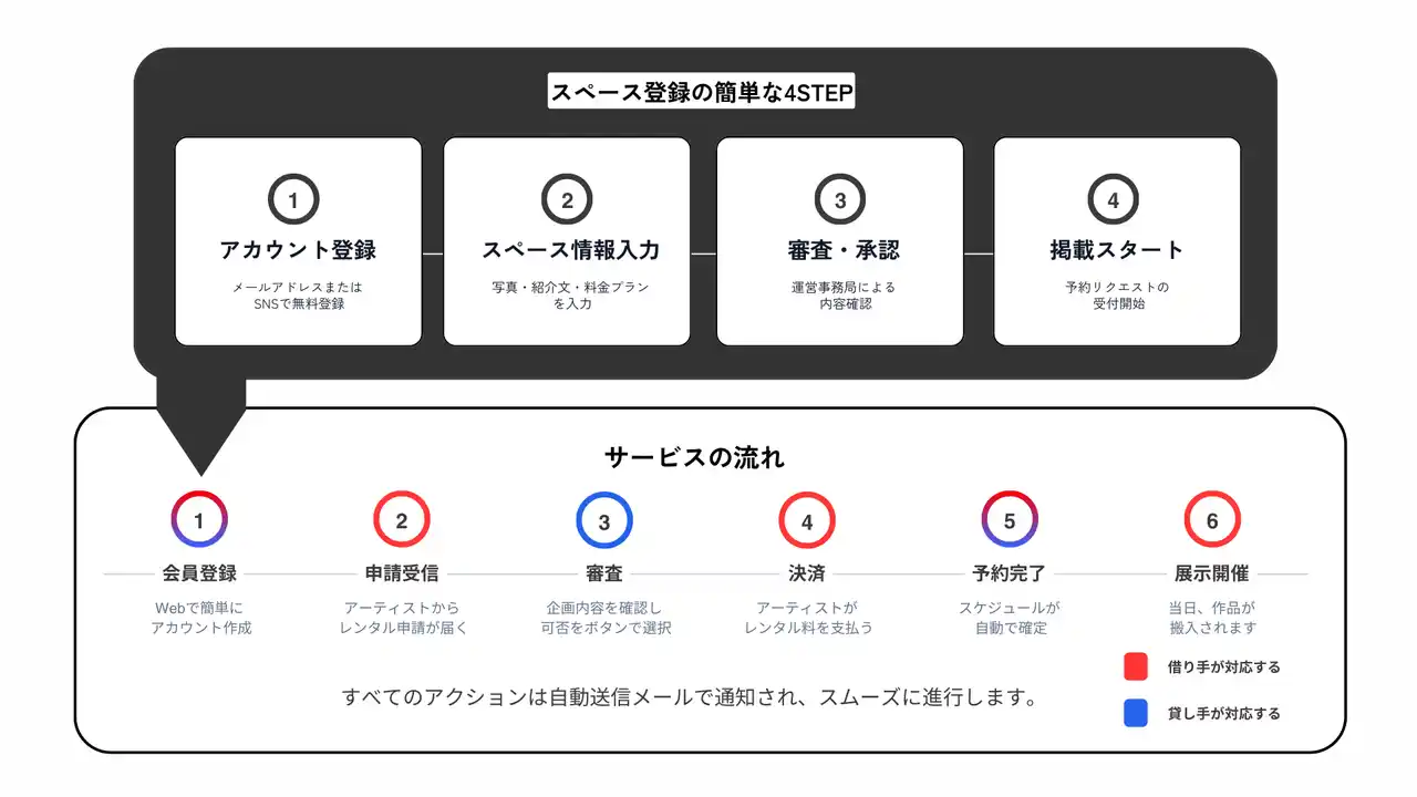 オーナー様は、スペース利用料を収益として受け取ることができます。 α版期間中は、運営サポートチームが登録から展示までを丁寧にフォローいたします。 |