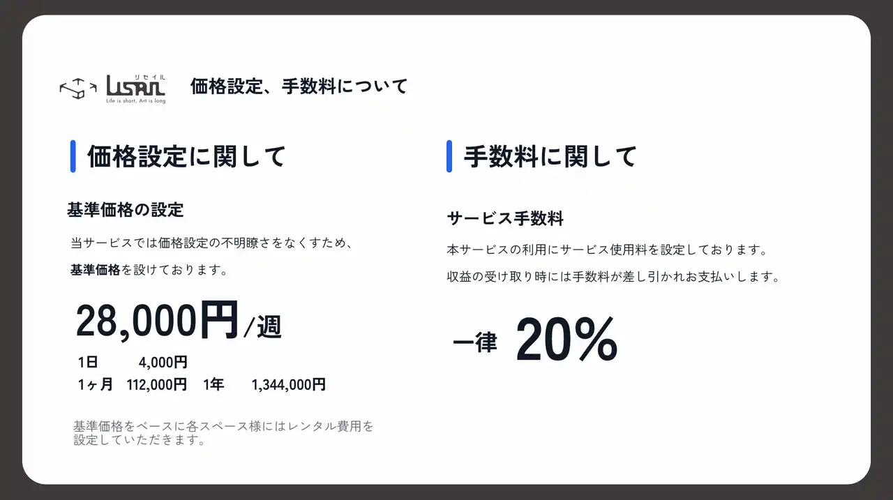「完全成果報酬型」を採用しています。 スペースが実際に利用された場合にのみ、利用料の一部をプラットフォーム手数料として頂戴する仕組みです。オーナー様に月額固定費などのリスクは発生しません。 |