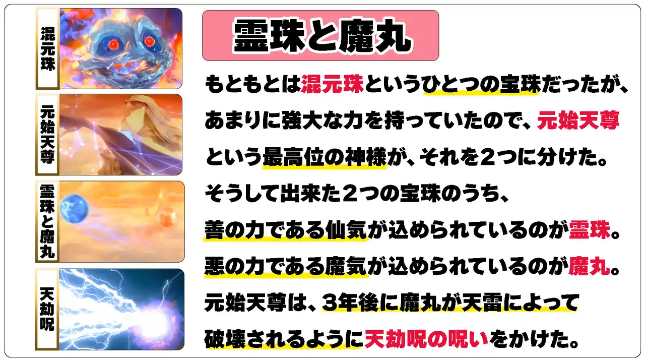 前作『ナタ 魔童降臨』(2019)では天界の秘宝「混元珠(こんげんじゅ)」が二つにわかれ、英雄となる運命を持つ「霊珠」はゴウヘイに、魔王となる宿命を背負う「魔丸」はナタにもたらされる。 |