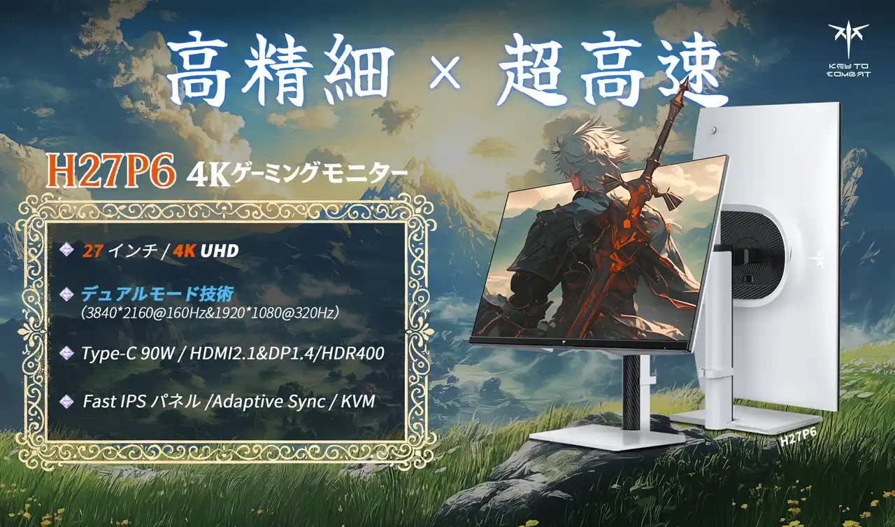 | 最後は、あらゆるゲームジャンルを最高の状態で楽しみたい方へ贈る、27インチ4K高性能モニター「H27P6」です。その最大の魅力は、「デュアルモード」機能。美麗なグラフィックを鑑賞したい大作は「4K@160Hz」で、超高速な応答が求められるFPSは「FHD@320Hz」へと、一瞬で切り替え。一台で二つの極致を体験できます。 | |||