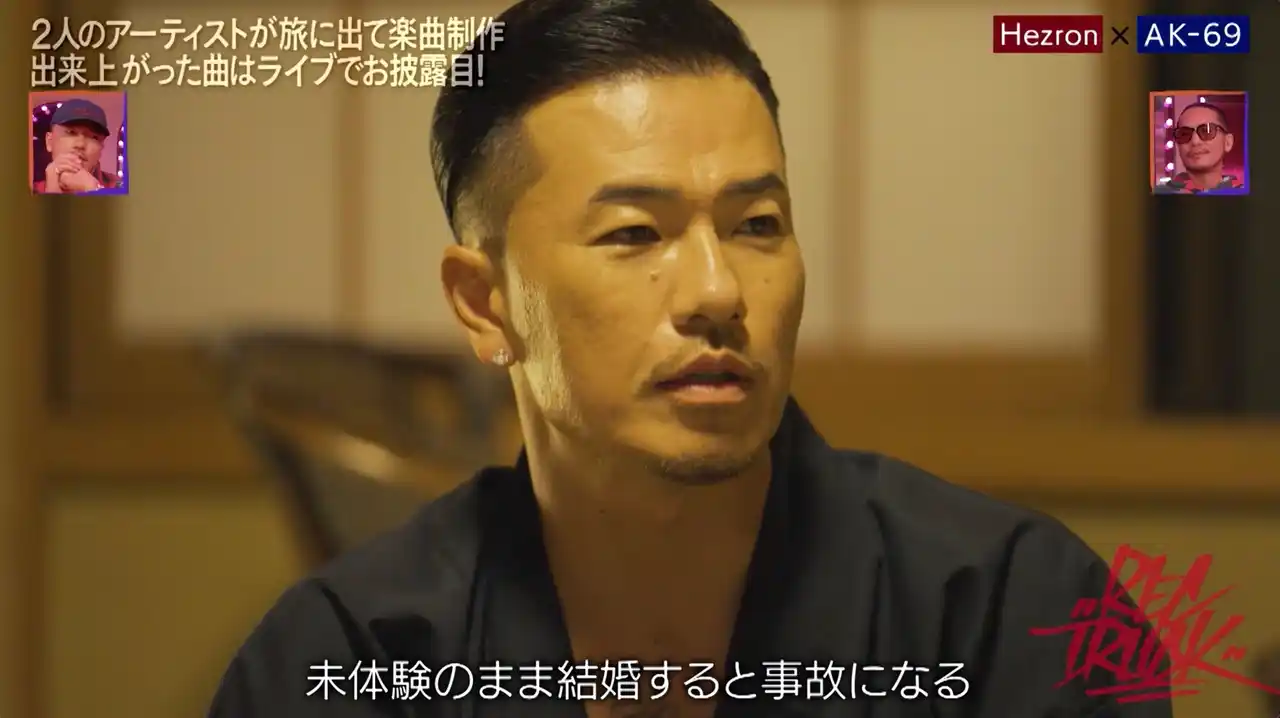 その後、身延山の東の端にある寺院・端場坊の宿坊にて、リリック制作に打ち込んだ2人。ビート選びでは、AK-69のこだわりとユーモアが炸裂することに。はじめからビートを1つに絞らずに2つのビートを選んだAK-69は、「1つのビートに決め込んで、何百回も聞きながら考えていると、リリックを書き上げてレコーディングを始めたら、小さい声で出ていたニュアンスが、大きい声出した時に全然ハマらない時がある。『俺の何時間を返してくれ!』みたいになる」と理由を明かしました。「女性も一緒」と続けたAK-69は「未体験のまま結婚すると事故になる」と持論を展開。「『何か違う!?』みたいな、そういう感じです」とまとめ、スタジオのZeebraから「例えがそこか!」とツッコミが飛びました。 |