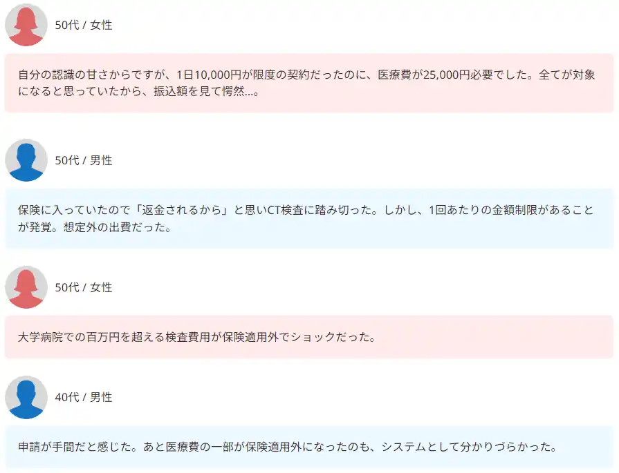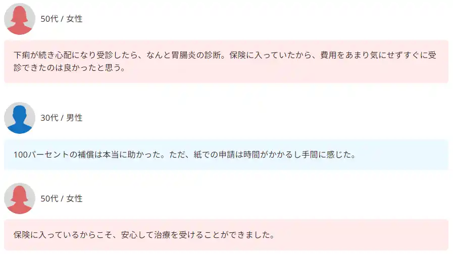 | 保険が日々のお財布の負担を和らげてくれるおかげで、小さな不調でもためらわずに受診でき、重症化を防げているという声も目立ちました。 | ||||||||||||
