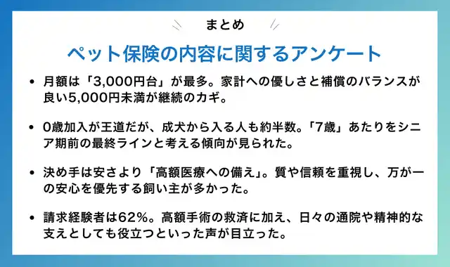 | この結果から、飼い主は単に保険料を抑えることよりも、「いざという時に十分な補償が受けられるか(=お守りとしての機能)」や、「周囲の信頼できる評判」を重視して保険を選んでいる実態が浮き彫りになりました。 | ||||||||||||