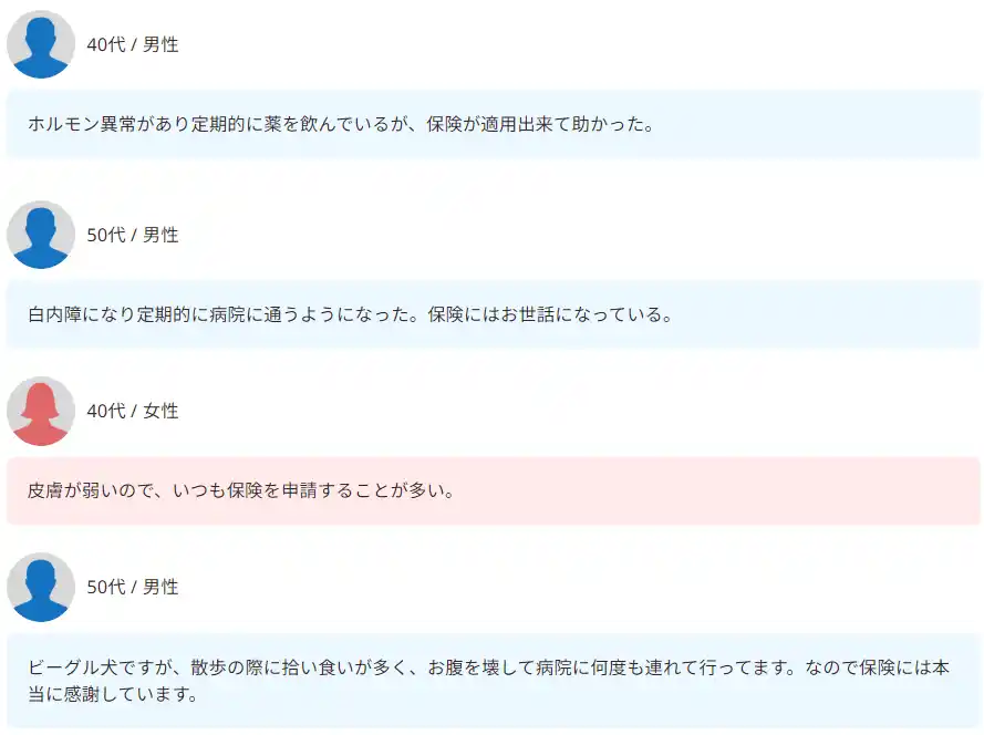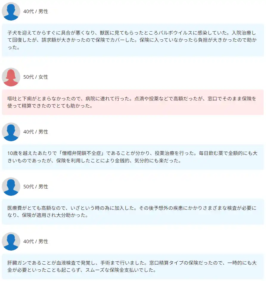 | ここからは、ペット保険を実際に利用した方の声をお伝えしていきます。 | ||||||||||||