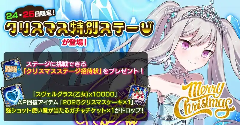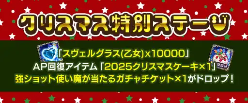 「クリスマス特別ステージ」をクリアすると、イベントアイテム「スヴェルグラス(乙女)×10000」、AP回復アイテム「2025クリスマスケーキ×1」、「強ショット使い魔が当たるガチャチケット×1」が獲得できます。 |