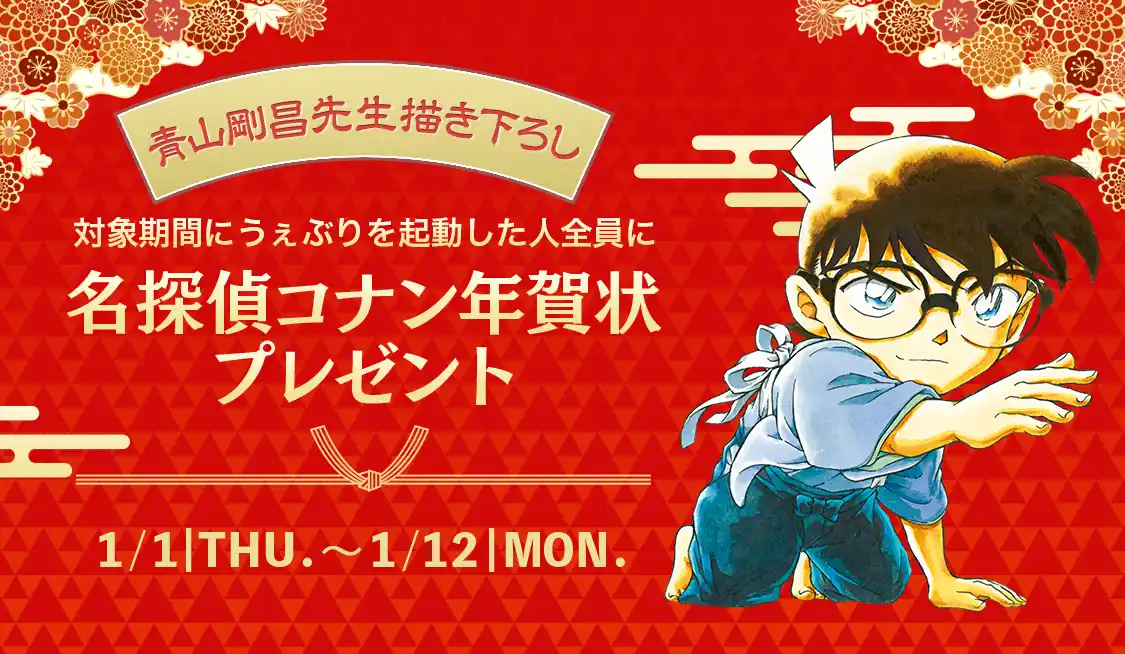 2026年1月1日(木)から1月12日(月)までの期間、サンデーうぇぶりアプリを起動した方全員に、『名探偵コナン』著者・青山剛昌先生描き下ろしの2026年版デジタル年賀状を配布いたします。 |