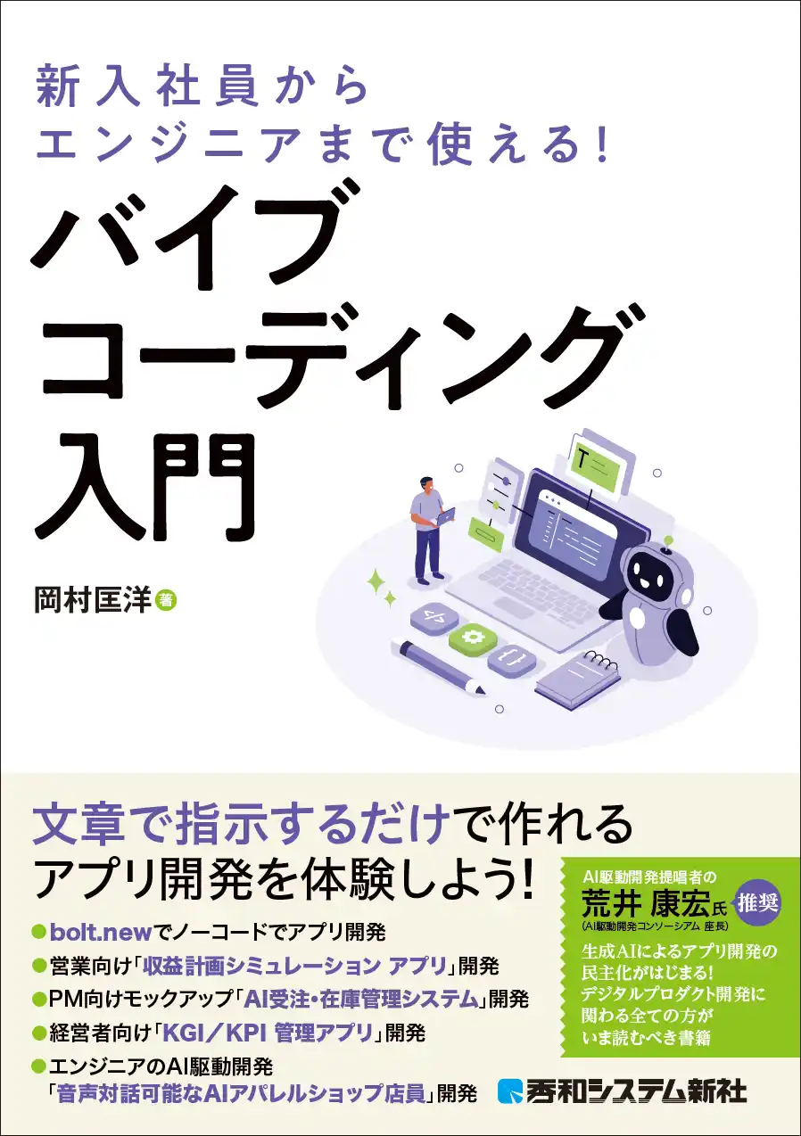 登壇する『新入社員からエンジニアまで使える! バイブコーディング入門』著者・岡村匡洋氏は、開発現場のみならず、AIを活用した新しいプロジェクト管理手法「AI駆動PM」の普及にも取り組んでいます。著者は次のように語っています。 |