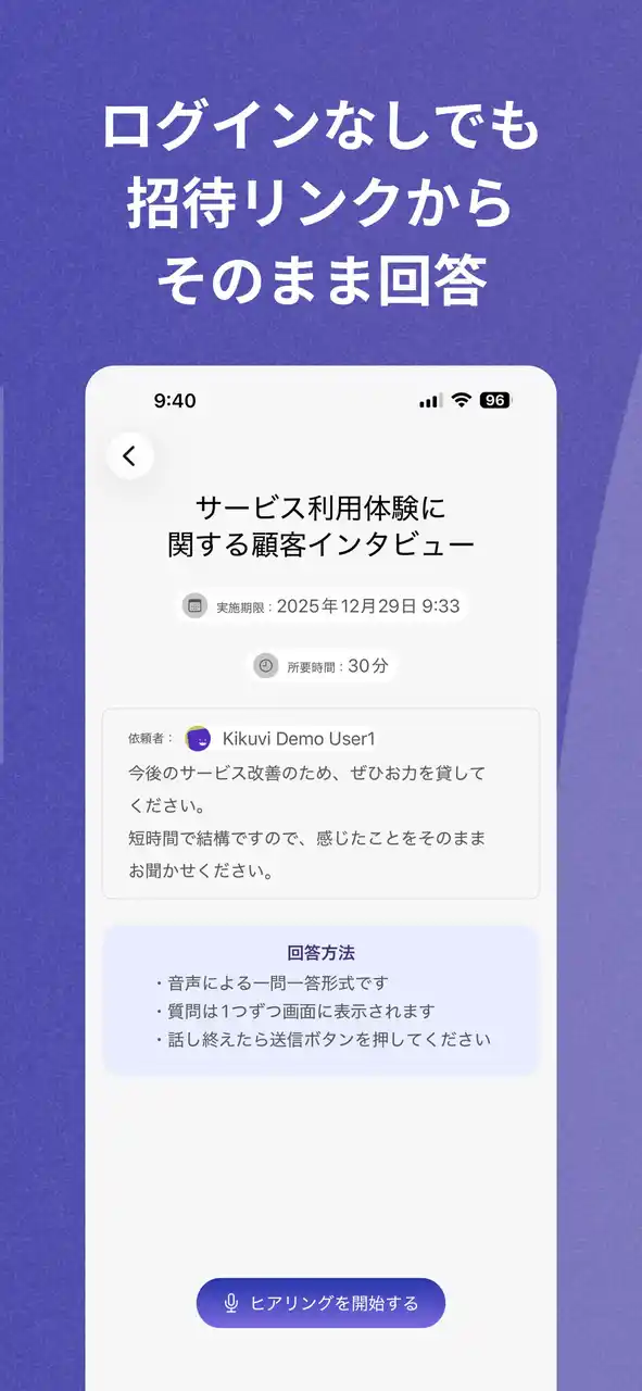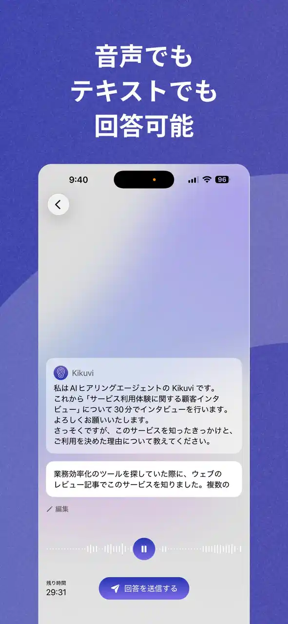 Kikuviは、大量のヒアリング業務を効率化・高度化するためのAI SaaSを開発・提供しています。AIがインタビュアーとなり、対象者への質問、回答の収録、内容の要約、そして重要なインサイトの抽出までを自動で行います。 企業の業務の現状把握、顧客インタビュー、1on1、要件定義の前のヒアリングなど、定性情報が重要となる幅広いビジネスシーンで導入が進んでいます。 |