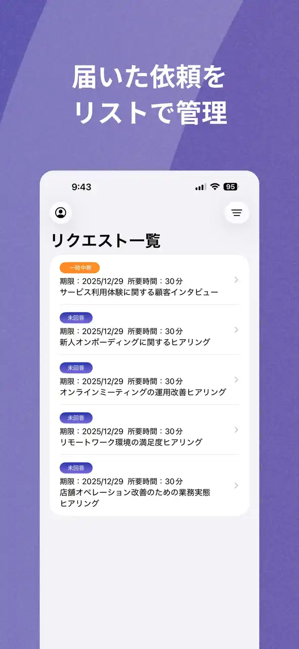 リクエスト機能のモバイル対応: 現在は「回答者」向けのみですが、今後はヒアリングを「依頼する側(管理者・インタビュアー)」もスマートフォンから操作・確認ができるよう、機能拡充を予定しています。 |