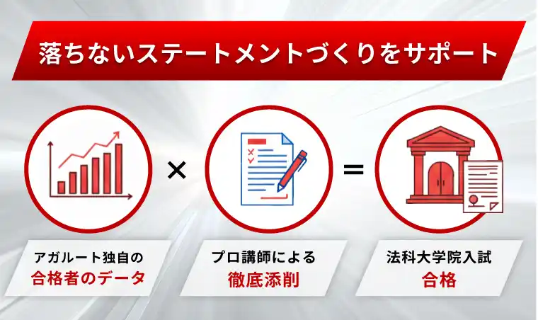 | 法科大学院入試において、必ず提出しなければならないものの、受験生の手が回っていないステートメント。アガルートでは過去の合格者のデータを用いて、ステートメントの方向性や注意点をお伝えし、落ちないステートメントづくりをサポートします。また、添削もついていますので、正しい方向性に導きます。 | |||||||||