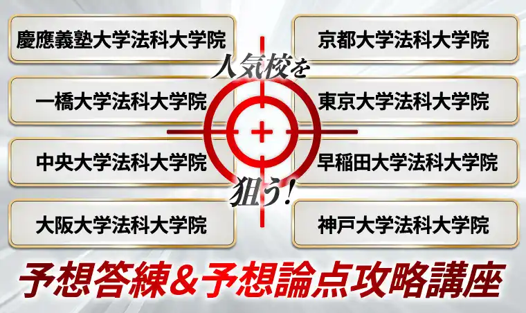 2つの個別法科大学院対策講座が新登場! 個別法科大学院対策の1.予想論点攻略、2.予想答練が追加になりました!人気の8校からお好きな3校をお選びください。 |