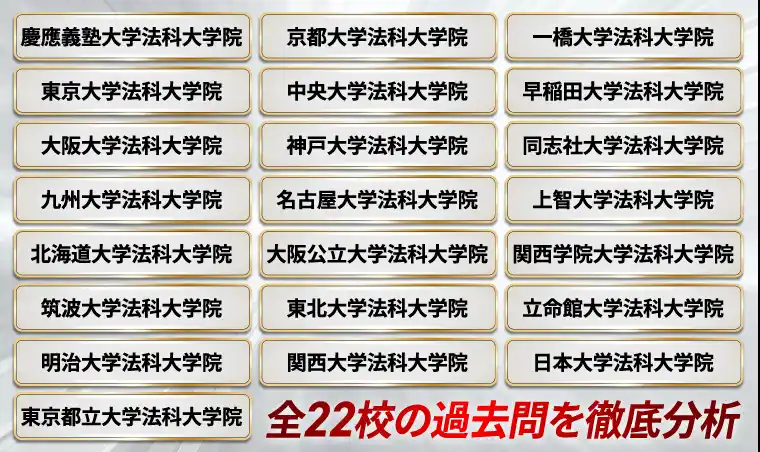 | 現在、法科大学院入試は熾烈を極め、かつての上位校を除く大学院においても、一定の倍率があるため、アガルートでは、なるべく多くの法科大学院の過去問を対策できるようにしております。主要な東西22校を掲載し、様々な選択肢を検討できるように準備しています。ここまでの大学院のサポートをしているのは、業界においては、アガルートだけ! ※随時追加予定 | |||||||||