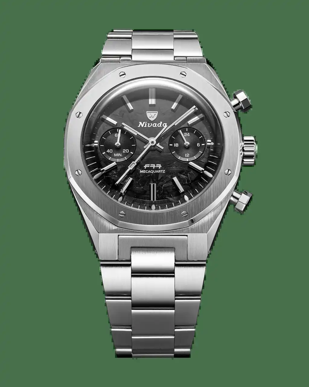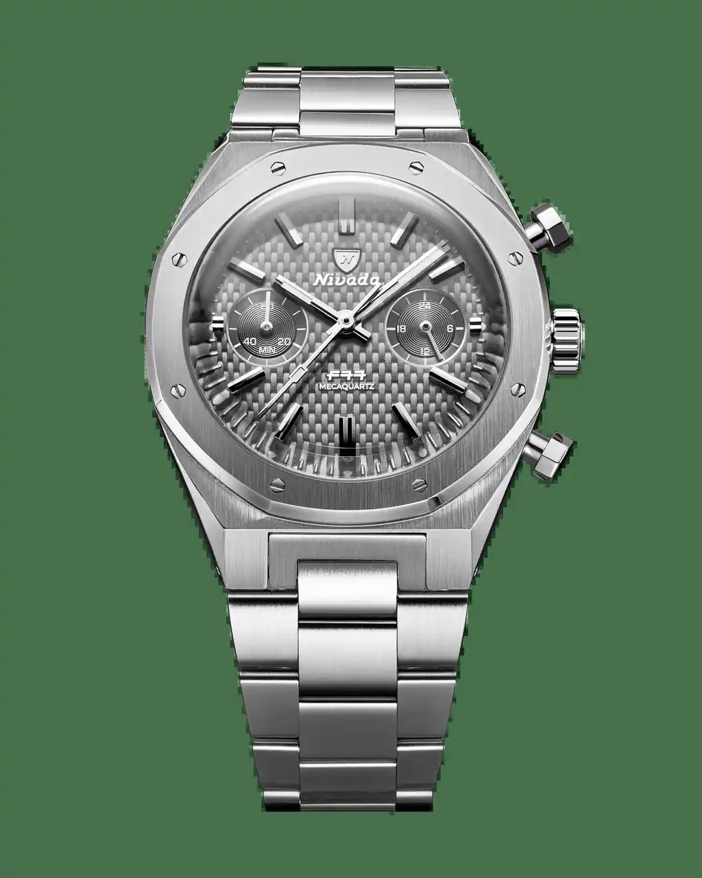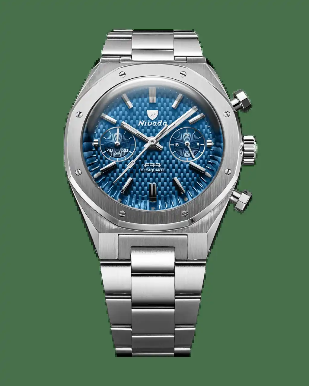 ChronoMecaquartz」は、シリーズとしては初のメカクォーツ・クロノグラフであり、既存モデルの復刻ではなく、完全な新コレクション。F77が築いてきたデザインコードを継承しながら、よりアクティブで現代的な使い勝手を備えたタイムピースに仕上げた。F77を象徴する“ウーブン(編み込み)パターン”を採用したブルーダイヤルとグレーダイヤル、そしてテクニカルな雰囲気を持つカーボンパターンのダイヤルを備えた、合計3品番がラインナップ。ブルーは光の角度によって表情が変化し、スポーティな清涼感を演出。