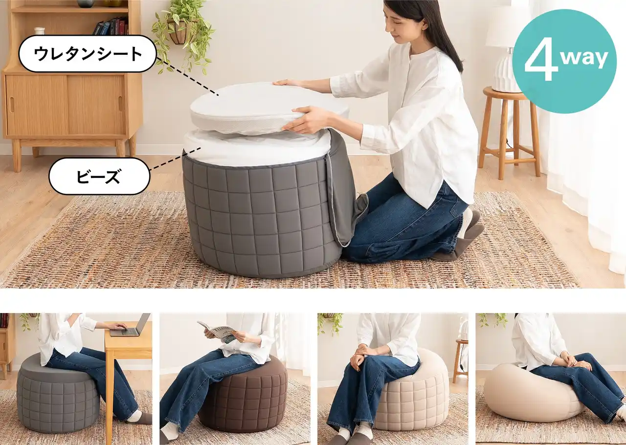 椅子代わりに使える新しいビーズソファ。立ち上がりを意識した設計と形状保持力で、コンパクトな暮らしに美しくフィットします。 |
