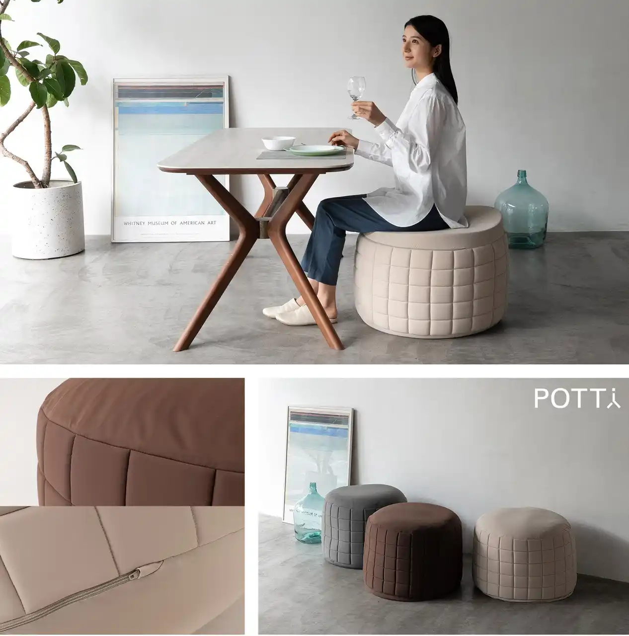 今までのビーズクッションは、深く沈み込み、ただ身を任せるためだけのものでした。ポッティは、人間工学の視点で高さと硬さを再設計した新しいビーズソファです。くつろぎたいとき、食事や仕事など作業したいとき、それぞれの場面で、最適な姿勢をサポートします。 |