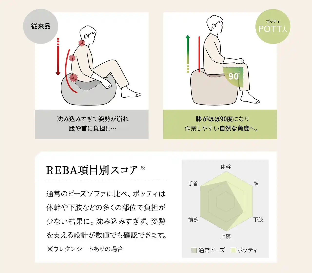 ポッティは快適さに加え、作業中の身体への負担を評価する国際的な分析手法[REBA]で検証。作業からリラックスまで、姿勢を保ちやすく、身体への負担が少ない座り心地を実現しました。 |
