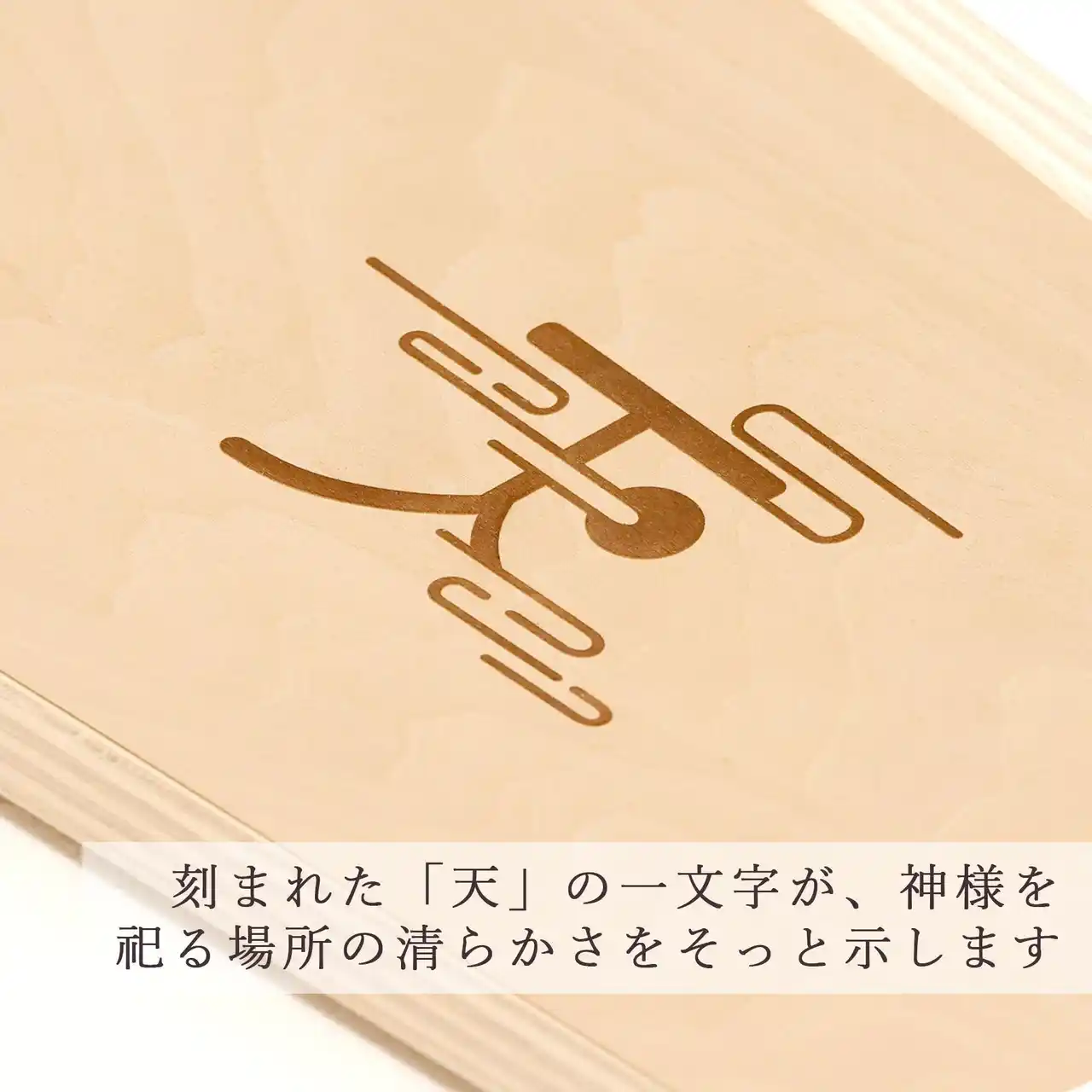 太陽と雲をモチーフにした「天」の字の焼き印を施しているため、雲紙を用意する必要もありません(雲紙とは、神棚の上に神様がいる空間を示すために用いられる「雲」や「天」の文字が書かれた紙です)。 |