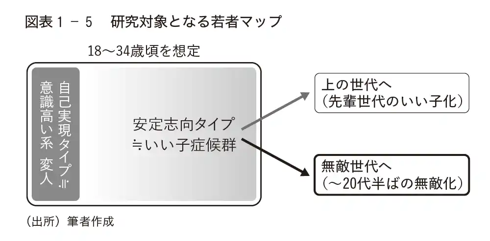 | 世間一般のZ世代像(意識高い・起業・SDGsに興味)は、実は1割程の「自己実現タイプ」に過ぎません。対して、若者の半数を占めるサイレントマジョリティこそが「いい子症候群」です。彼らは目立つことを嫌い、冒険よりも現状維持を好む「安定志向タイプ」。キラキラしたイメージとは対極にあり、競争を避け静かに自己を守ることで現代社会を生き抜いています。 | |||||||||||||||