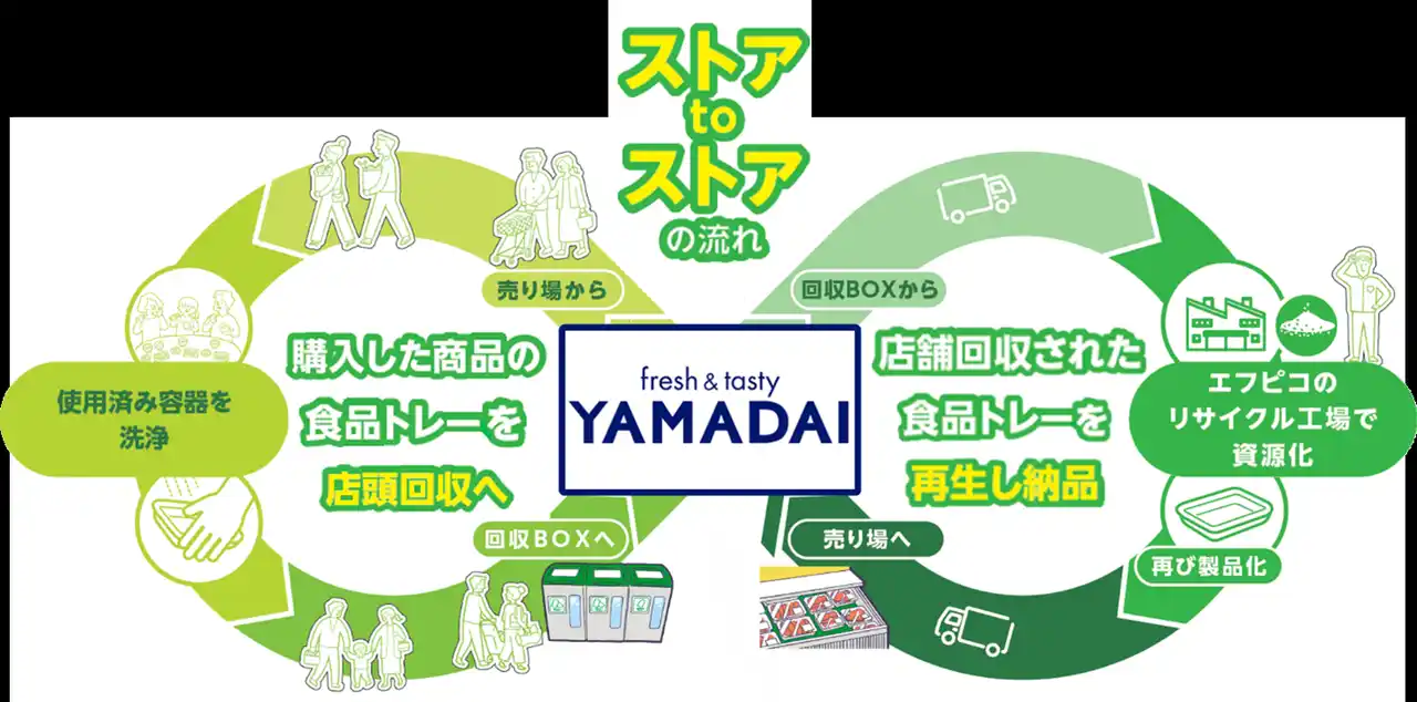 エフピコとスーパーヤマダイは、「お店がその地域のエコリーダー」となることを目指し、スーパーヤマダイの店頭に設置している回収ボックスにて、地域の皆さまにお持ちいただいた使用済み食品トレー・透明容器を回収しております。回収した使用済み食品トレー・透明容器はすべてエフピコで資源として活用され、エコ製品※2へと生まれ変わります。このエコ製品を再びスーパーヤマダイの売り場で使用することで、お店を発着点とする「ストアtoストア」の水平リサイクルを実現しております。 |