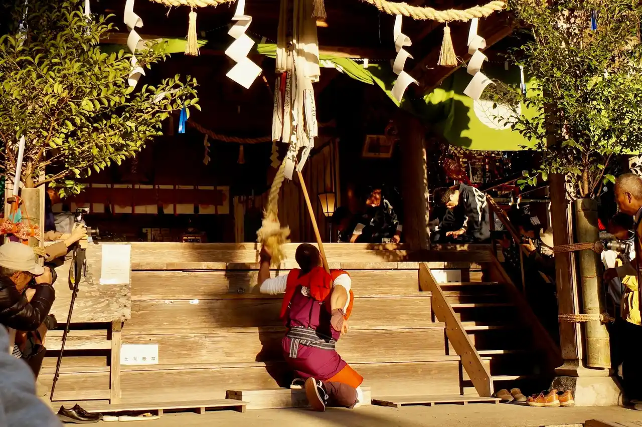 | 鳥毛・羽熊が一人ずつ登場し、大鳥毛を拝殿の中に練り込んで練り戻し、そして、参道を掃くようにしながら下がっていく儀式です。練り込んだ際に鈴を鳴らすため片手で大鳥毛を支えたり、地面すれすれまで大鳥毛をおろしたり、鳥毛・羽熊の力が試される大一番とあって観客にも緊張が走ります。 | ||||||||||||||