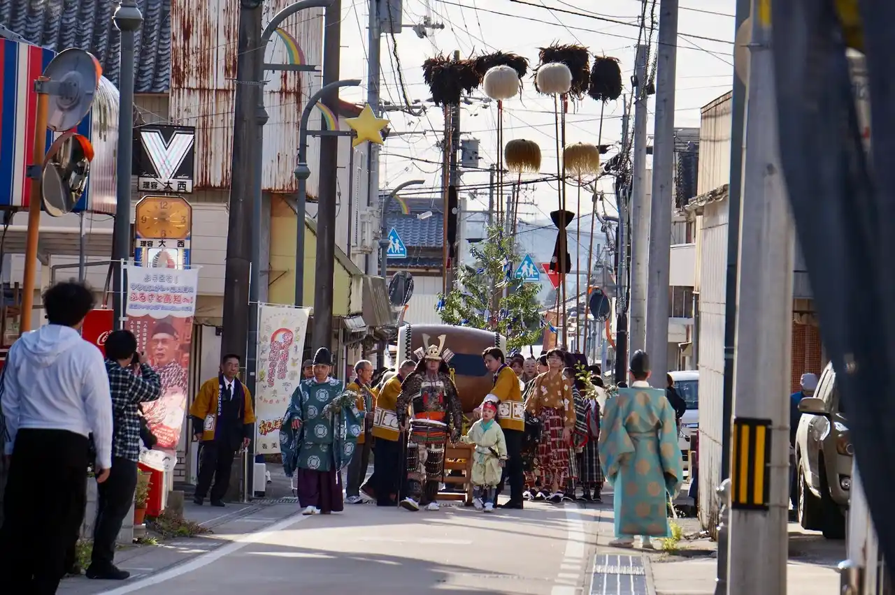 | 武者、太鼓、獅子舞、そして神様が宿った御神輿らの行列が神社を出発し、氏子地域を練り歩いて約700メートル離れた御旅所の神明宮を目指し、神社に戻ってきます。 | ||||||||||||||
