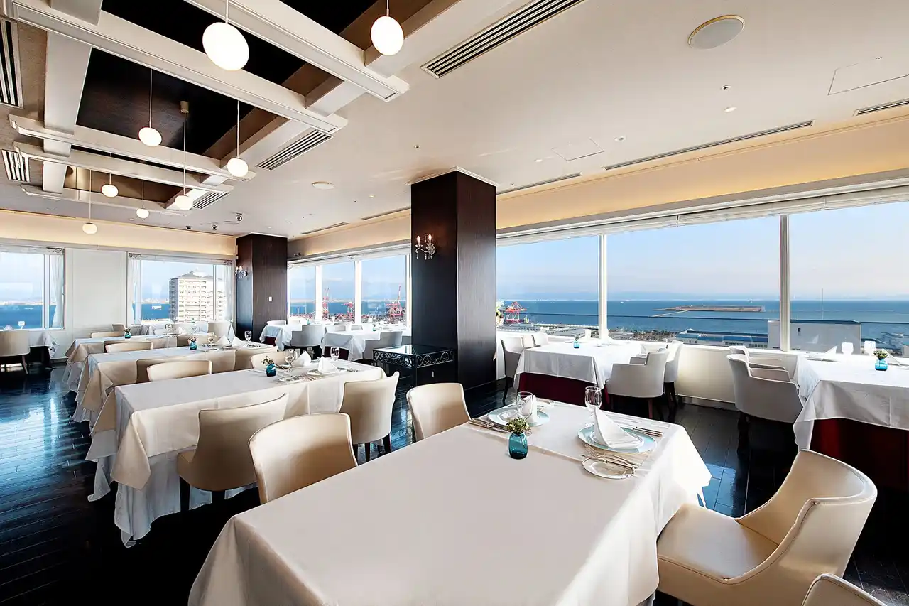 ホテルプラザ神戸最上階に位置し、海の風景を満喫できるメインダイニング。 |