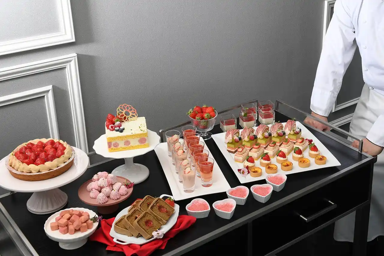 ランチ・ディナーコースでは、スタッフがお席までデザートワゴンを運び、目の前でお好きなデザートを選べる食べ放題スタイルで提供します。(土日祝日のディナーを除く) 気になるデザートを少しずつ味わったり、お気に入りを何度でもおかわりしたりと、自分のペースで、イチゴデザートを存分に楽しめるのが魅力です。 |
