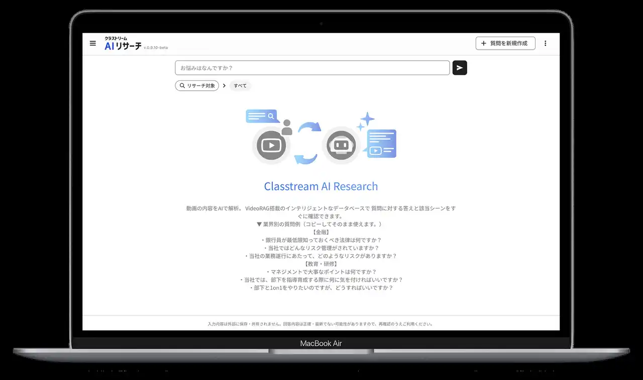 「AIリサーチ」は、蓄積された膨大な動画データの中から、知りたい情報をチャット形式で検索できる機能です。 |