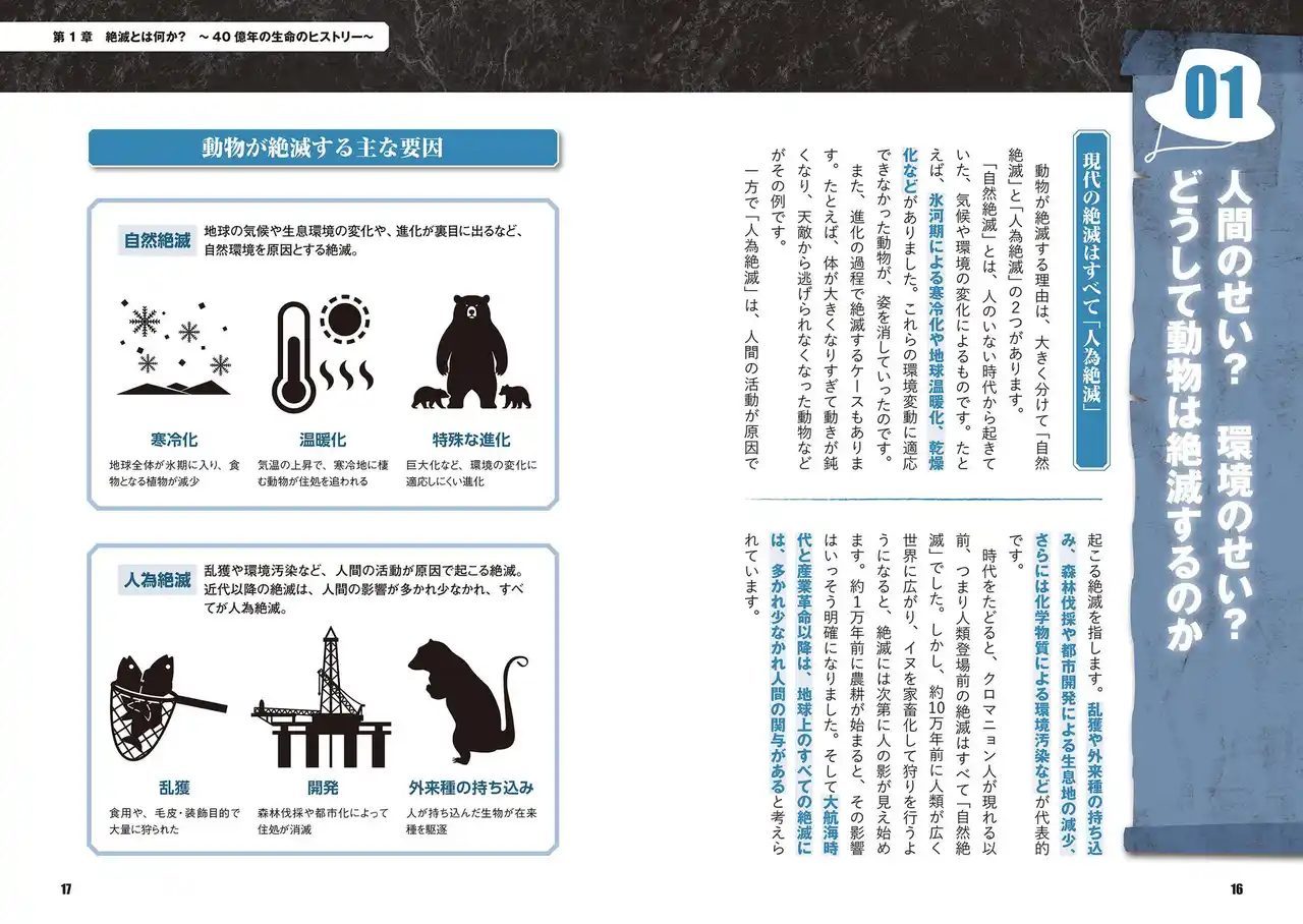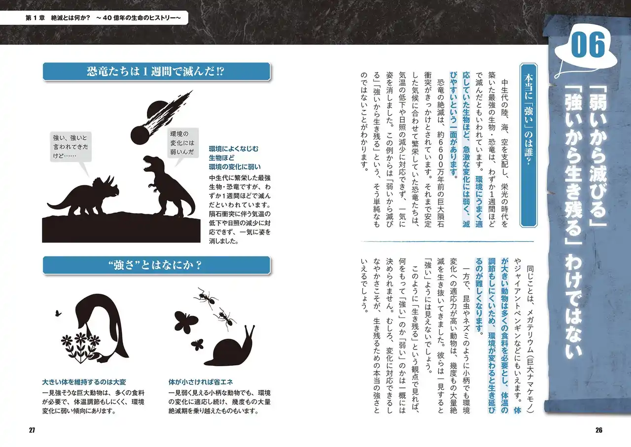 | 第1章:絶滅とは何か? ~40億年の命のヒストリー~ 「大量絶滅事件」の謎と、生物が歩んできた激動の歴史。 | |||