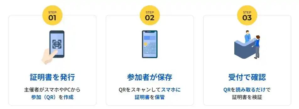 STEP 01:発行(Issuer) 主催者がスマホやPCから証明書を発行 。 |