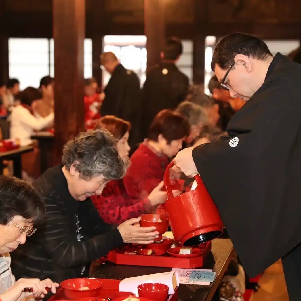 通常非公開の国宝 書院「鴻之間」(こうのま)にて、お斎を召しあがっていただくことができます。ご用意するお斎は、150年以上続く老舗精進料理屋「矢尾治」(やおじ)より、丁寧な調理方法にで作っていただいたものです。 |